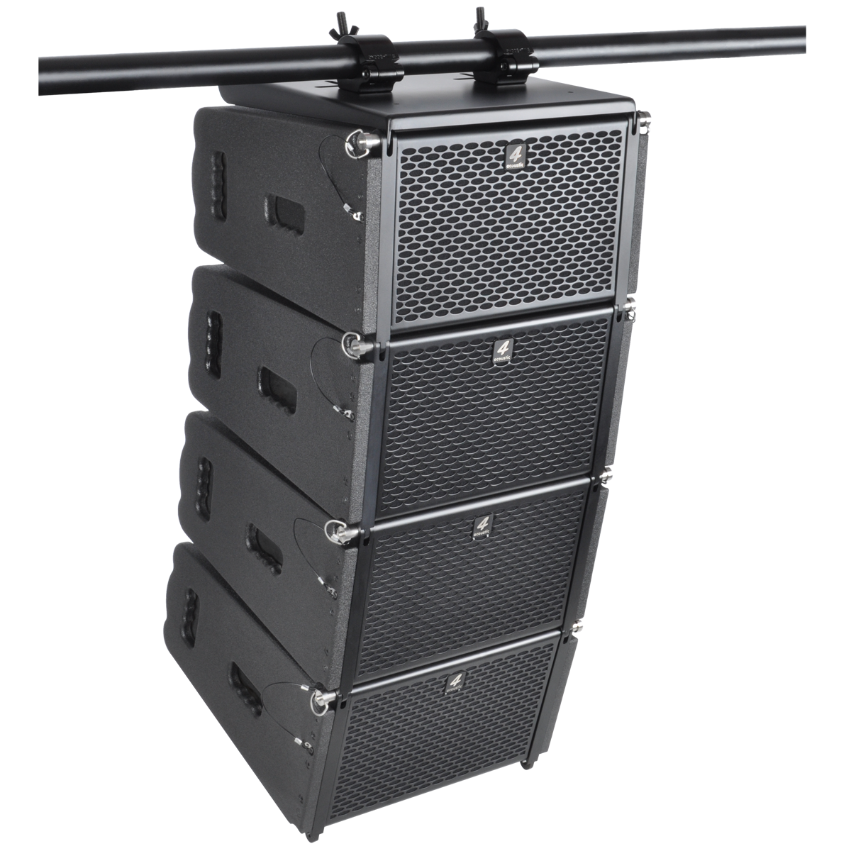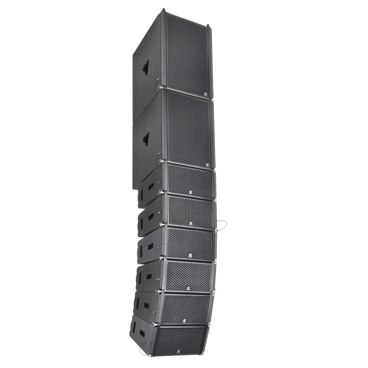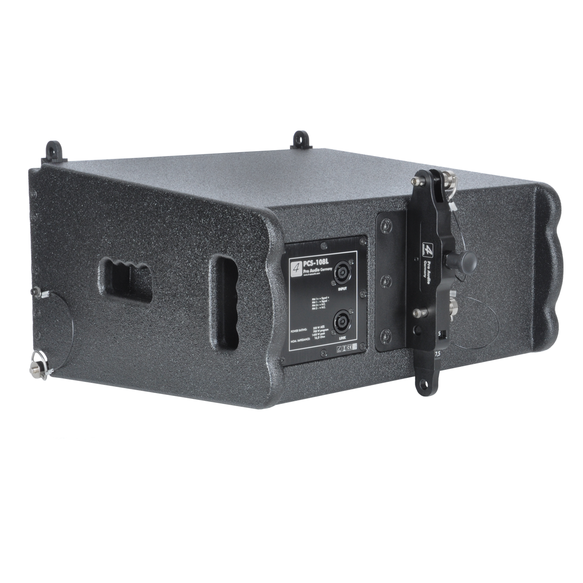 PCS-108L is a compact size, high power speaker to use in vertical line array columns up to 12 units per flight frame. The mechanical design offers a vertical adjustment from 0° to 9° with a resolution of 1,5° per step. For an easy setup of the vertical angel PCS-108L is equipped with a simple but clever mechanical brake. The entire flyware is made of high quality, extreme resilient aluminum components. This two way passive system comprise of a 8” Neodymium woofer and two 1” drivers connected to an accurate calculated wave transformer. The maximum SPL of a single unit is 131 dB. The coverage pattern is 10°x120° (v x h). The impact and weather resistant housing is made of best quality multiplex wood and covered with a strong, water-resistant Polyurea coating. Four integrated handles will support an easy transport and installation. The front side of the speaker is protected by a 1,5 mm strong, black metal grill covert with black color acoustic foam. The flight frame construction allows hanging and standing installation on PCS subwoofers. The compact size and 2-way passive design guarantee a maximum of flexibility in use with our DSP system controller and DSP integrated system amplifiers.