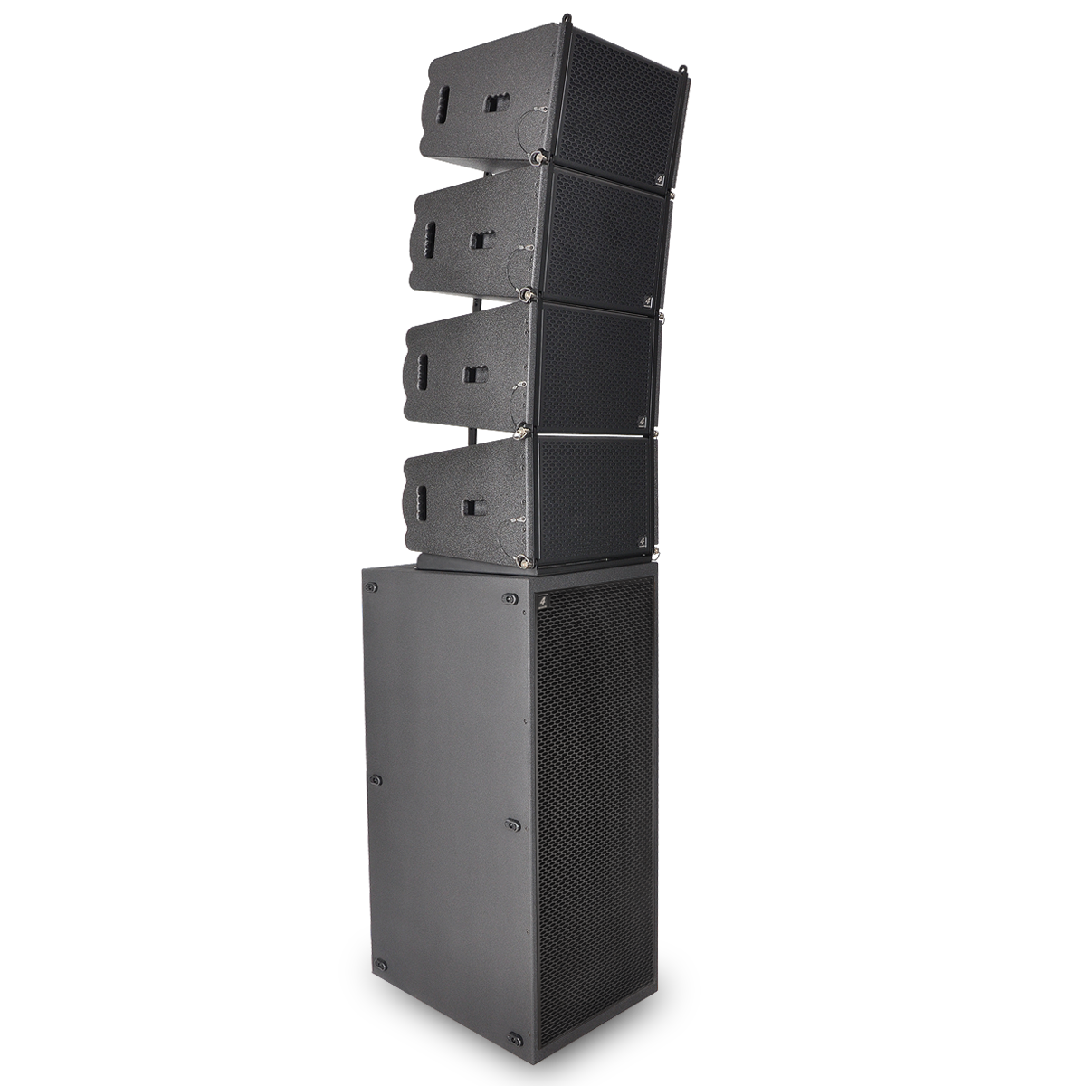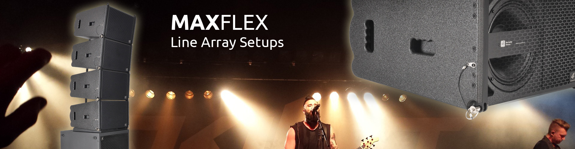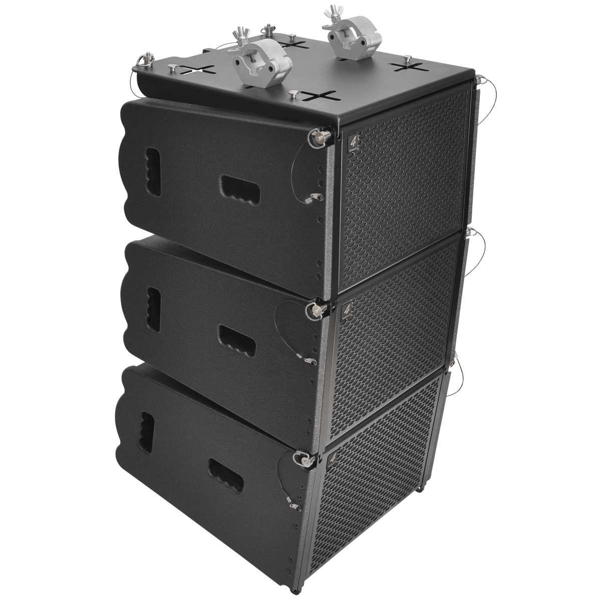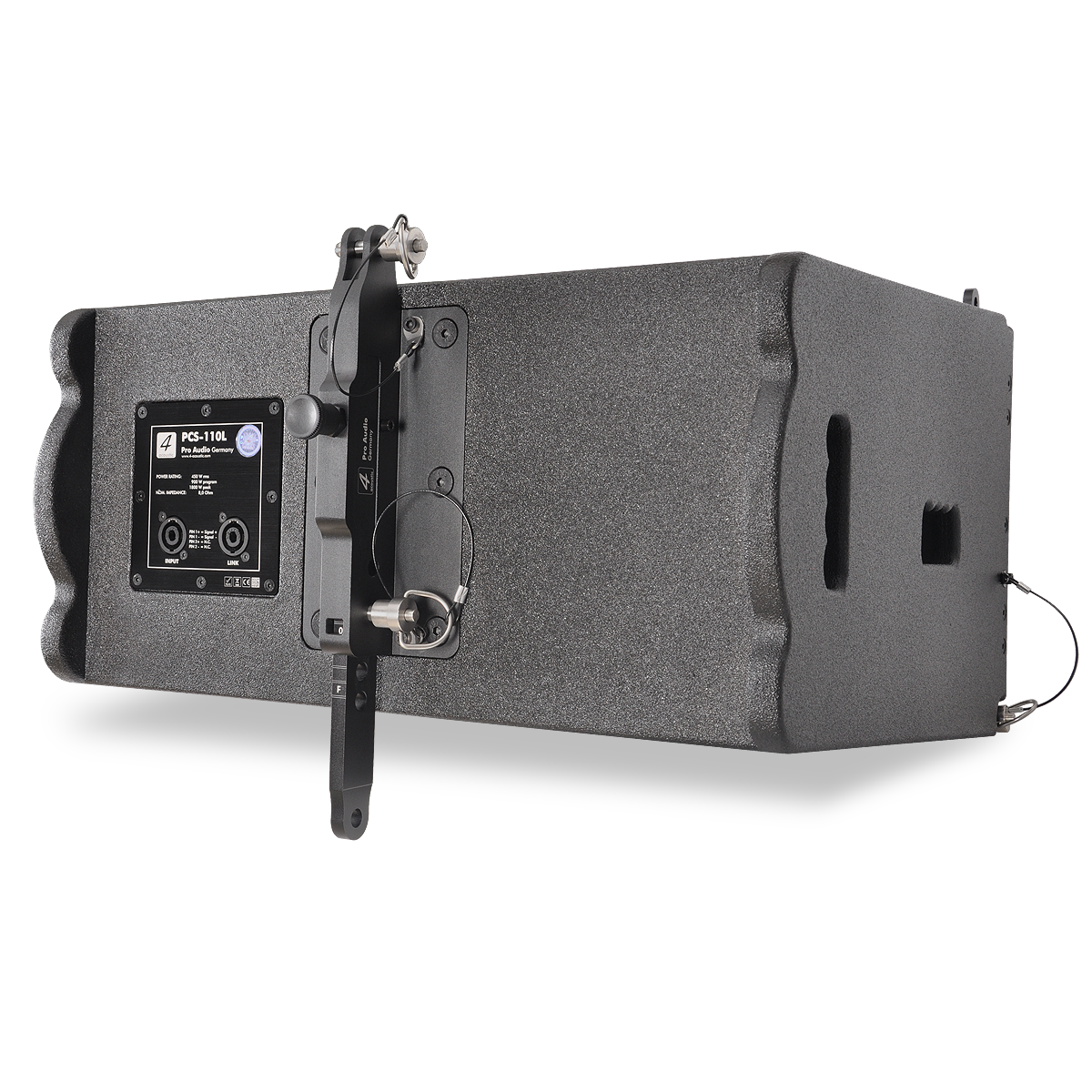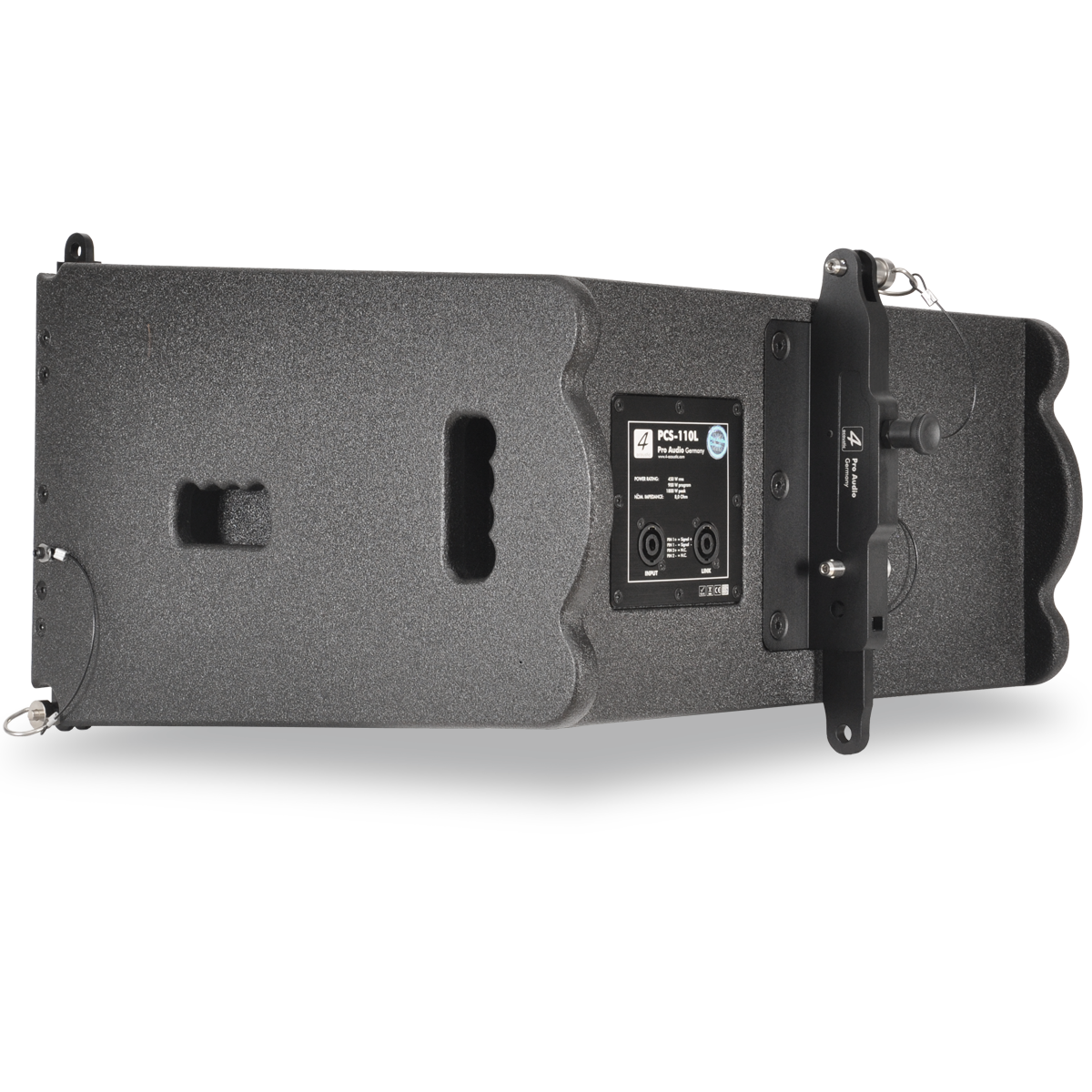 PCS-110L is a compact size, high power speaker to use in vertical line array columns up to 24 units per flight frame. The mechanical design offers a vertical adjustment from 0° to 10° with a resolution of 1,0° per step. For an easy setup of the vertical angel PCS-110L is equipped with a simple but clever mechanical brake. The entire flyware is made of high quality, extreme resilient aluminum components. This two way passive system is comprised of one 10” Neodymium woofer and two right mounted 1” drivers connected to an accurate calculated wave guide. The maximum SPL of a single unit is 133 dB. The coverage pattern is 10°x120° (v x h). The shock-proof and wheather-resistant housing is made of best quality Baltic multiplex wood and covered with a strong, black water-resistant Polyurea coating. Four integrated handles will support an easy transport and installation. The front side of the speaker is protected by a 1,5 mm strong, black metal grill covered with black color acoustic foam. The construction of the two different available flight frames allows multi-functional hanging and standing installation.