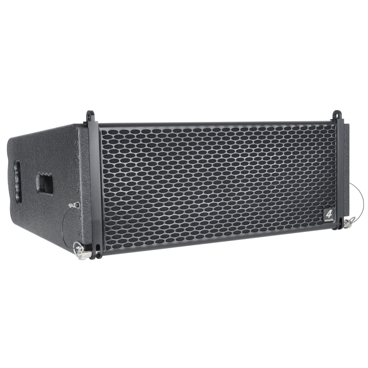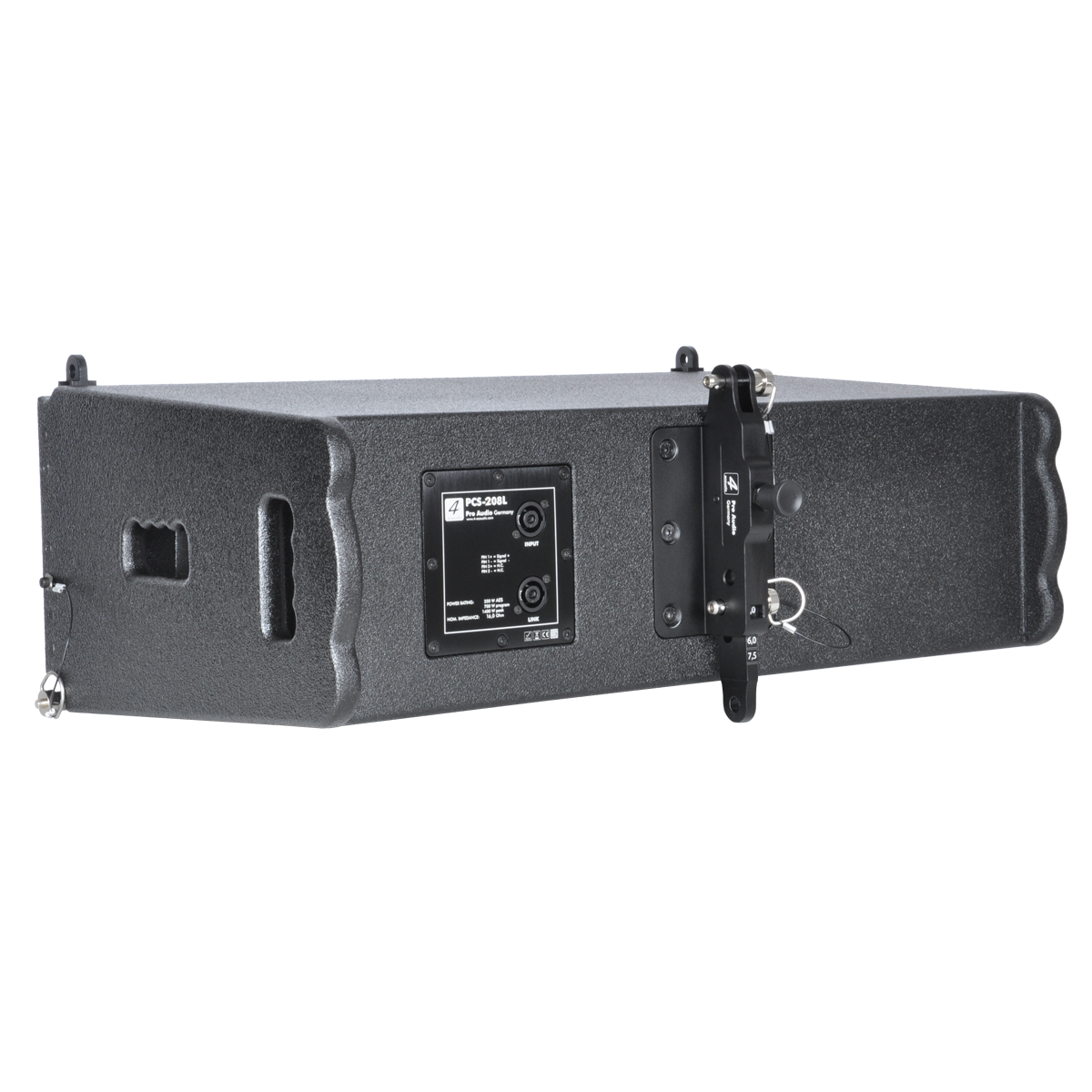 PCS-208L is a compact size, high power speaker to use in vertical line array columns up to 24 units per flight frame. The mechanical design offers a vertical adjustment from 0° to 9° with a resolution of 1,5° per step. For an easy setup of the vertical angel PCS-208L is equipped with a simple but clever mechanical brake. The entire flyware is made of high quality, extreme resilient aluminum components. This two way passive system comprise of two 8” Neodymium woofers in dipole arrangement and two centrally mounted 1” drivers connected to an accurate calculated wave transformer. The maximum SPL of a single unit is 134 dB. The coverage pattern is 10°x120° (v x h). The impact and weather resistant housing is made of best quality multiplex wood and covered with a strong, water-resistant Polyurea coating. Four integrated handles will support an easy transport and installation. The front side of the speaker is protected by a 1,5 mm strong, black metal grill covert with black color acoustic foam. The flight frame construction allows hanging and standing installation on PCS subwoofers. The compact size and 2-way passive design guarantee a maximum of flexibility in use with our DSP system controller and DSP integrated system amplifiers.