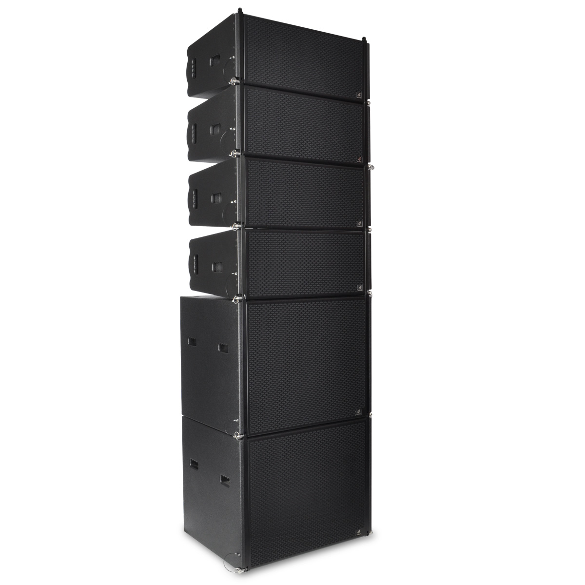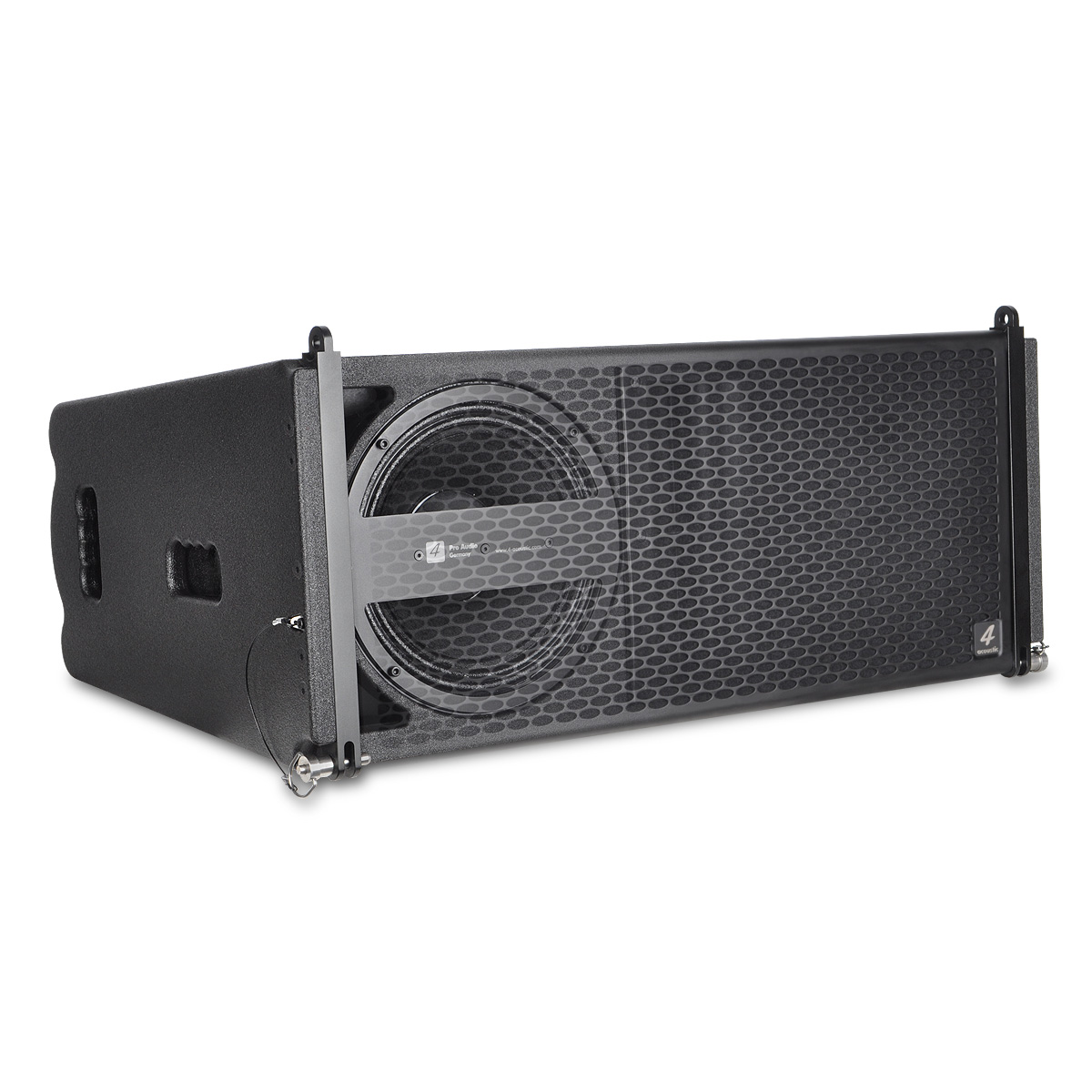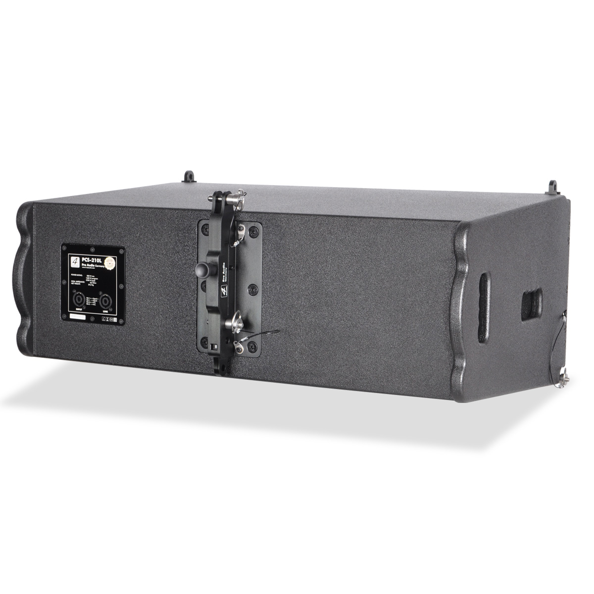 PCS-210L is a compact size, high power speaker to use in vertical line array columns up to 24 units per flight frame. The mechanical design offers a vertical adjustment from 0° to 10° with a resolution of 1,0° per step. For an easy setup of the vertical angel PCS-210L is equipped with a simple but clever mechanical brake. The entire flyware is made of high quality, extreme resilient aluminum components. This two way passive system is comprised of two 10” Neodymium woofers in dipole arrangement and two centrally mounted 1” drivers connected to an accurate calculated wave guide. The maximum SPL of a single unit is 136 dB. The coverage pattern is 10°x120° (v x h). The shock-proof and wheather-resistant housing is made of best quality Baltic multiplex wood and covered with a strong, black water-resistant Polyurea coating. Four integrated handles will support an easy transport and installation. The front side of the speaker is protected by a 1,5 mm strong, black metal grill covert with black color acoustic foam. The flight frame construction allows hanging and standing installation on PCS subwoofers. The compact size and 2-way passive design guarantee a maximum of flexibility in use with our DSP system controller and DSP integrated system amplifiers.