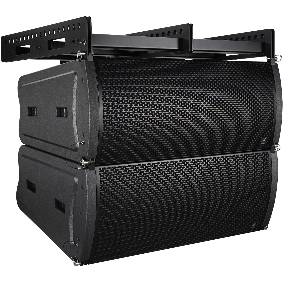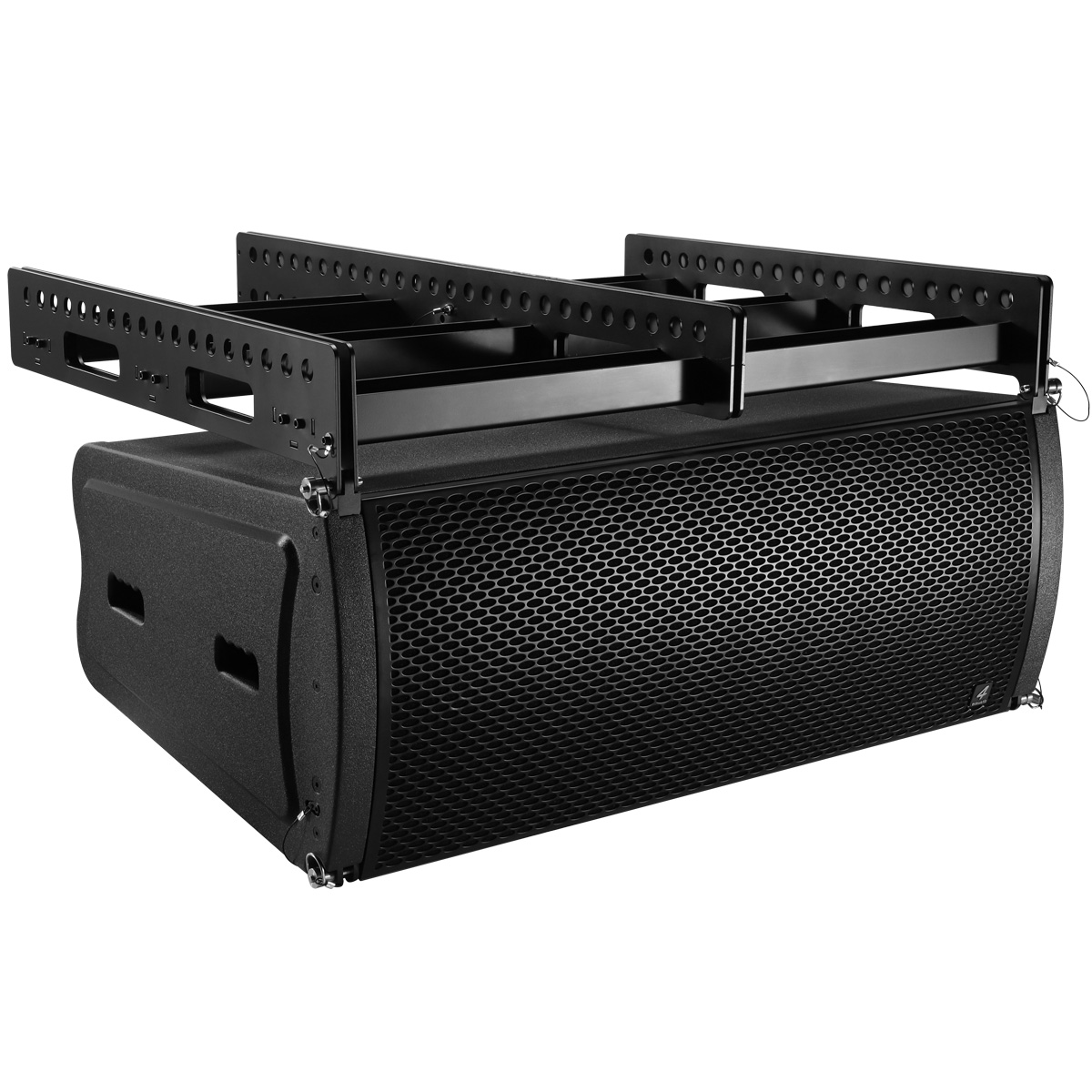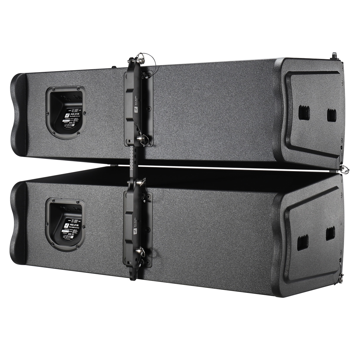 PCS-212L is a compact size, 3-way speaker to use in vertical line array columns up to 10 units per flight frame. The mechanical design offers a vertical adjustment from 0° to 10° with a resolution of 1,0° per step. The entire flyware is made of high quality, extreme resilient aluminum components. This 3-way system is comprised of two 12” neodymium woofers four 6,5” neodymium Low/Mid chassis and two centrally mounted 1,4” neodymium drivers with 2,5” voice coil. The drivers are connected to an accurate calculated horn. The maximum SPL of a single unit is 143dB. The coverage pattern is 10°x120° (v x h). The shock-proof and wheather-resistant housing is made of best quality Baltic multiplex wood and covered with a strong, black water-resistant Polyurea coating. Four integrated handles will support an easy transport and installation. The front side of the speaker is protected by a 1,5 mm strong, black metal grill covert with black color acoustic foam. The flight frame construction allows hanging and standing installation on PCS subwoofers. The 3-way module is operated as a 2-way bi-amp system and therefore requires only two amplifier channels. The compact size guarantees a maximum of flexibility.