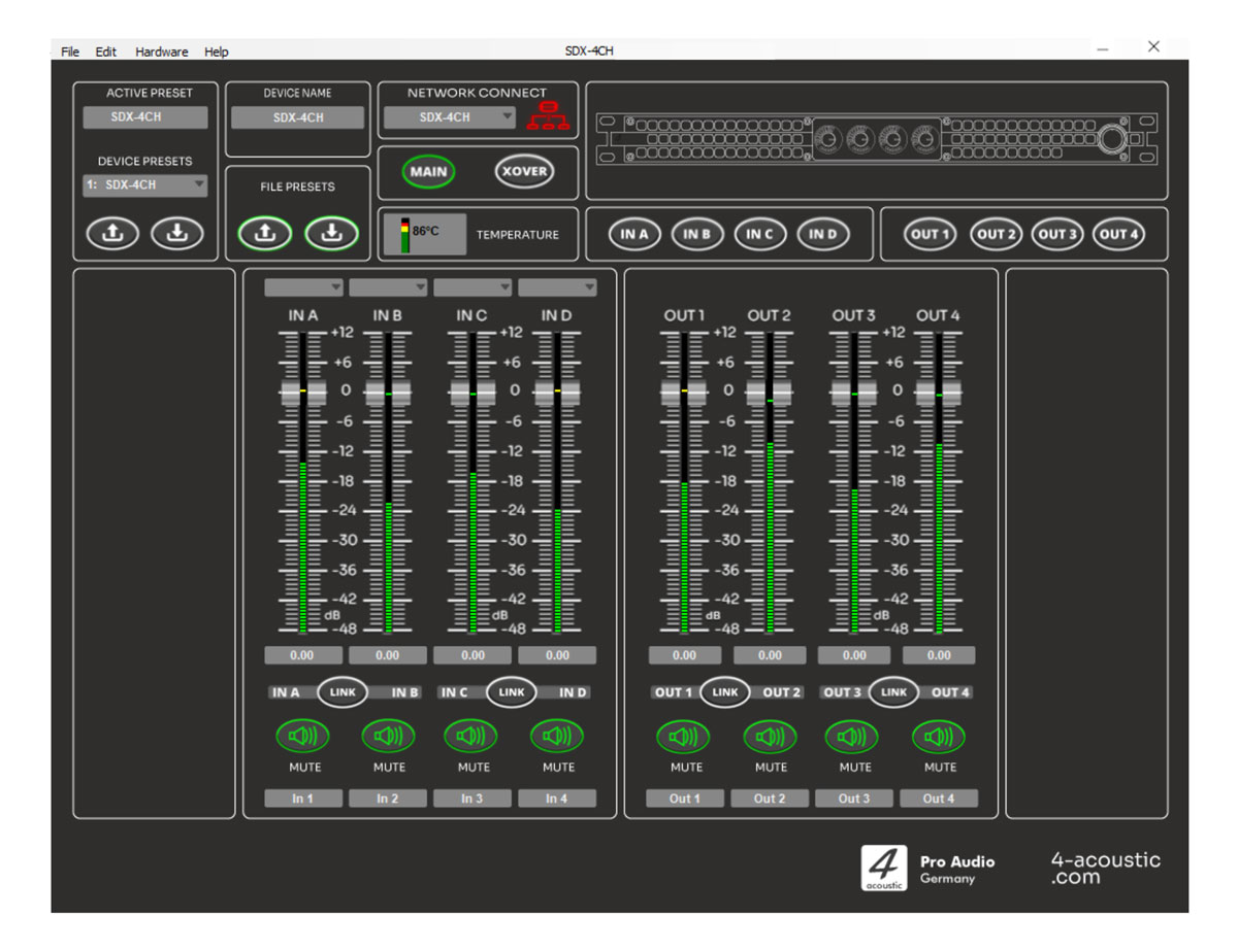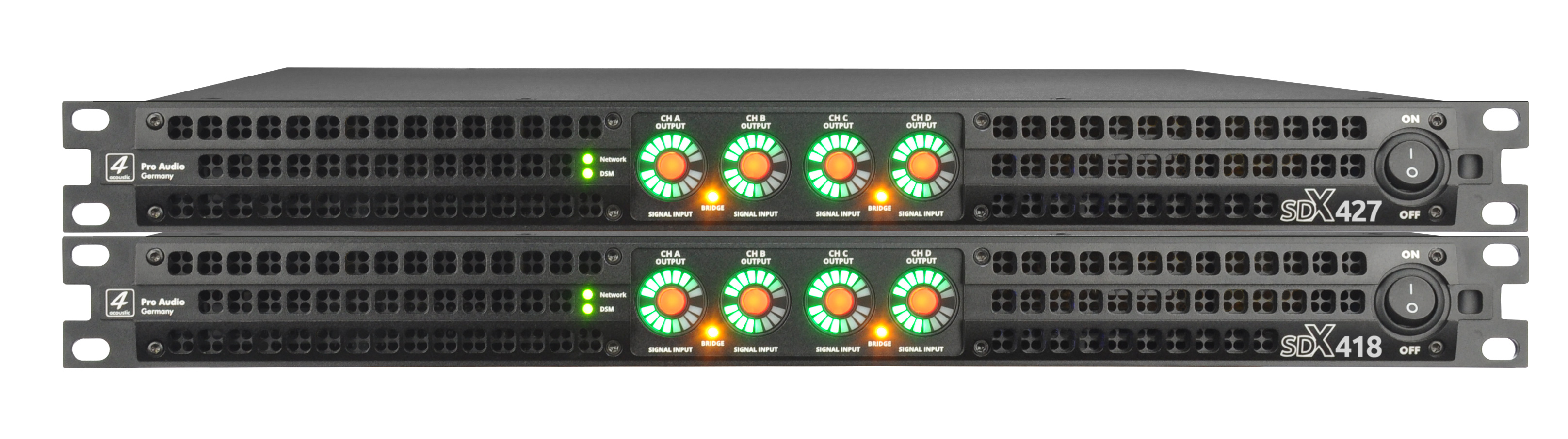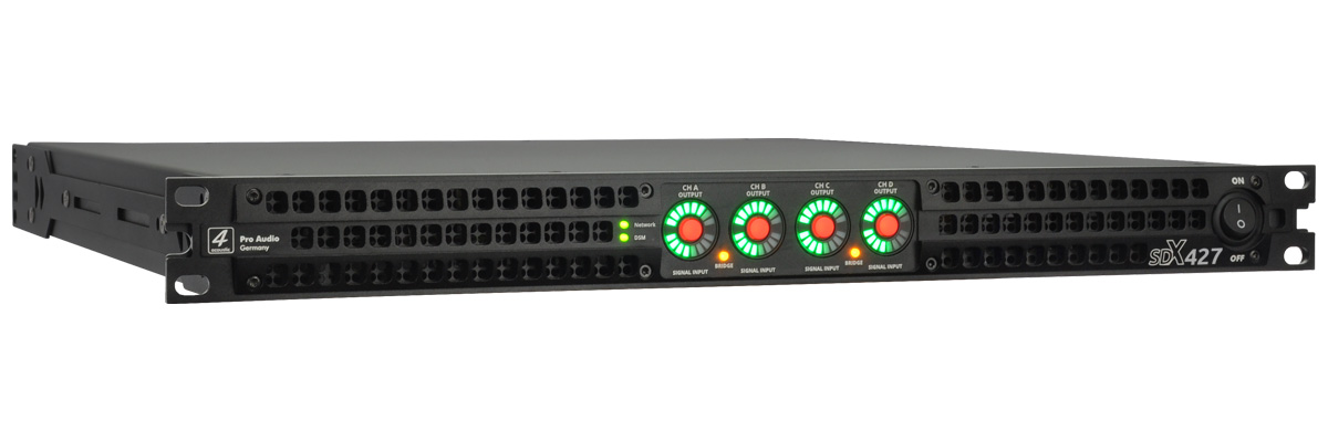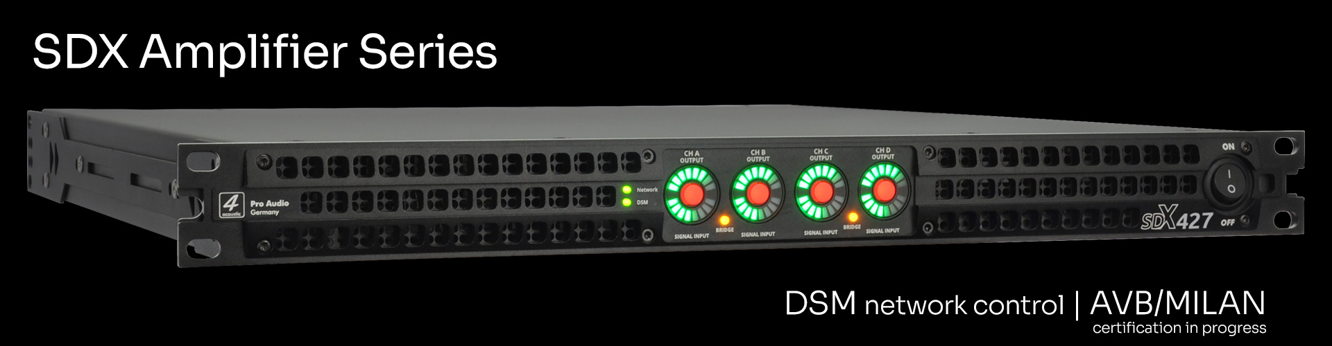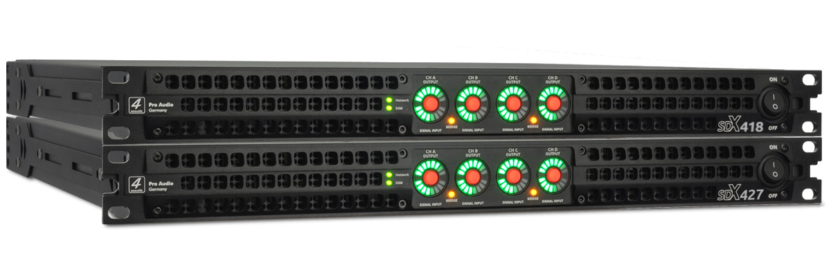 The SDX Series is the logical evolution of the successful SX Series in 1U Class D technology. The integration of the DSB board, developed and produced in Germany, has made it possible to achieve impressive performance data. Like the DSM-428 and 428-FIR DSP processors, the SDX power amplifiers are managed and programmed via the DSM Network Client. The SDX power amplifiers can be controlled individually or in groups via the DSM software. Output power has also been significantly increased. The SDX-427 now delivers 4x3500 watts into 8 ohms and the SDX-418 4x2000 watts into 8 ohms. The integrated AVB/MILAN interface is currently undergoing certification. The built-in interface allows the SDX Series to be integrated as a listener in AVB/MILAN networks. Audio streams can then be routed to the SDX power amplifier via the AVB network management. In an AVB / MILAN network, audio streams are transmitted with virtually no latency, even over long distances.